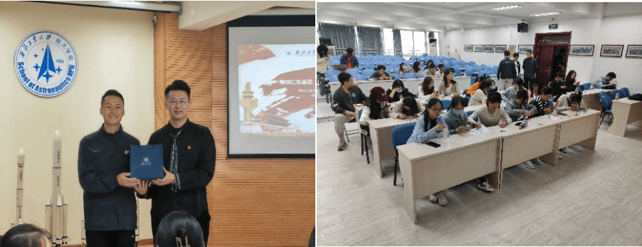 飞行控制研究所研究生第2党支部张正卿同志为对方支部的同学们介绍了导弹模型的工作原理、长征系列火箭的知识科普和卫星在轨服务的大致运转流程。