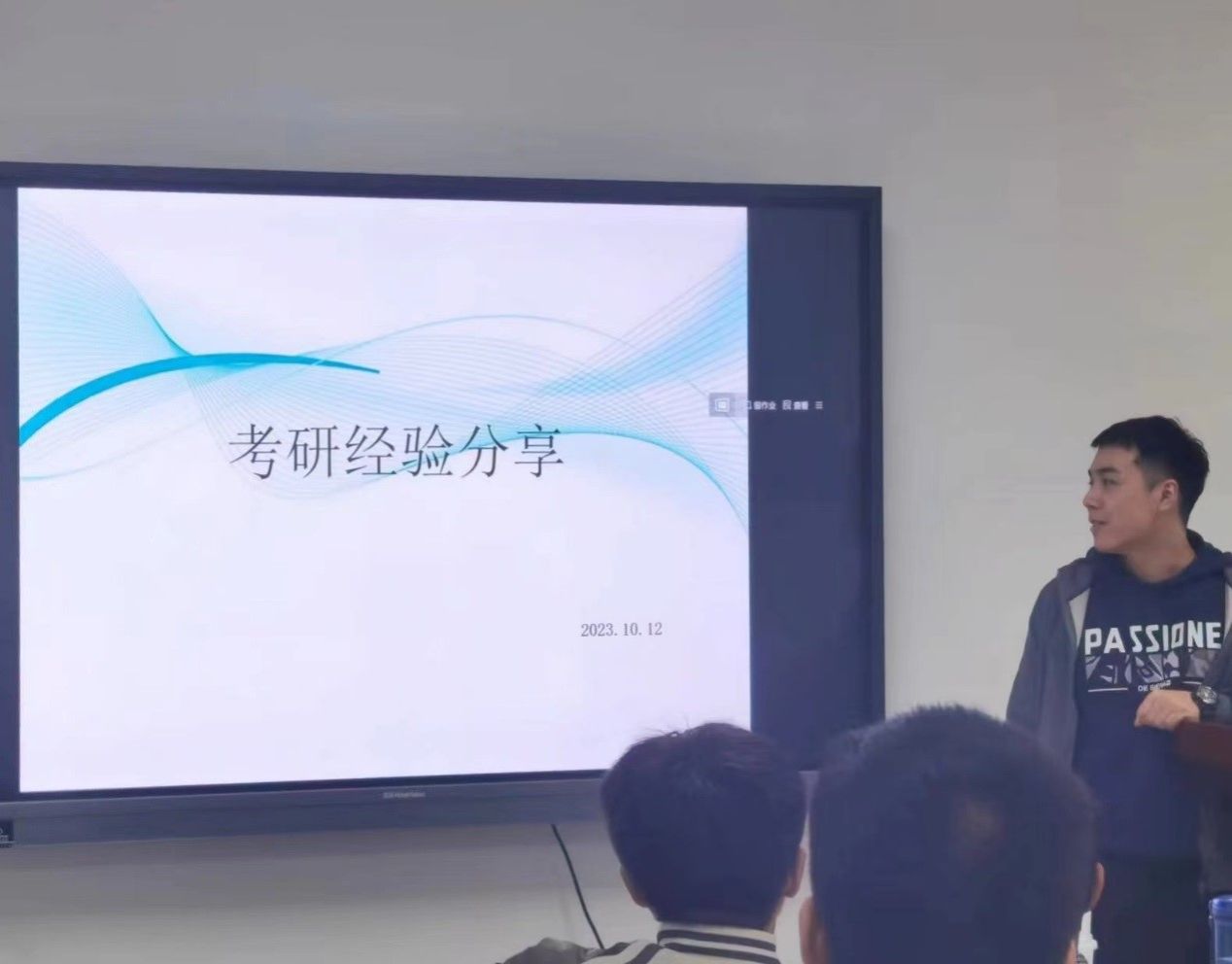 随后,获得考研高400+的两位学长依次进行分享。初试成绩405分的母珺琛学长主要强调了考研课程的各阶段准备情况,分享自己在备考过程中时间的安排和刷题的小窍门,鼓励同学们在备考阶段沉下心来,并祝愿大家取得佳绩。