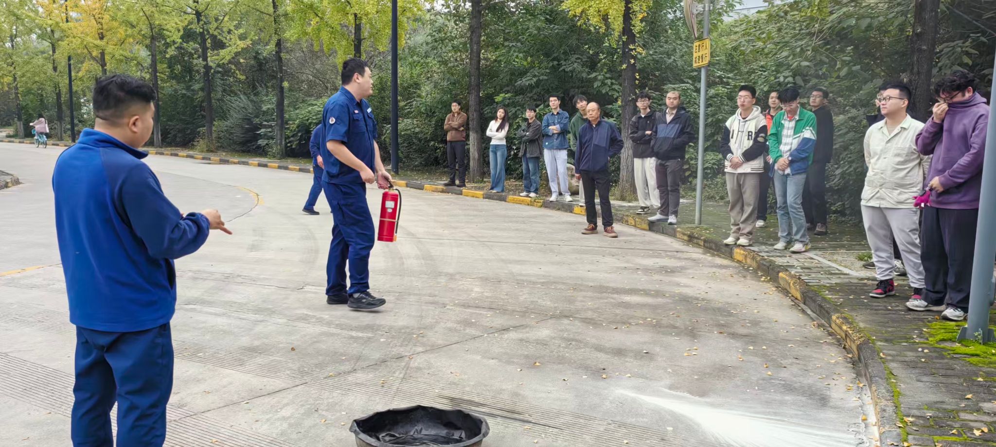 在长安校区海天苑大楼门口区域开展消防安全演练,40余名师生参加演练。