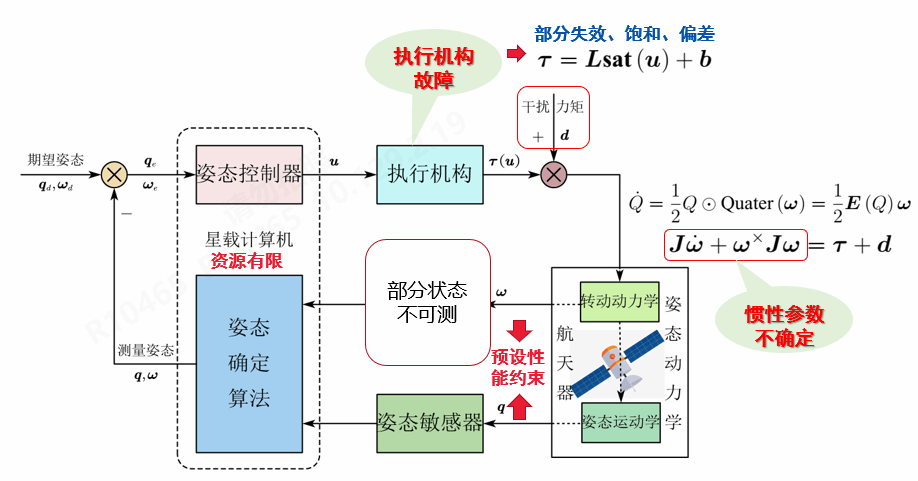 空间操作技术研究所航天飞行动力学技术国家级重点实验室,面向国家航天领域重大需求开展研究,主要针对在轨服务任务中普遍存在的惯性参数不确定、未知动态干扰、执行机构故障、部分状态不可测和全状态运动约束等问题,考虑实际工程中航天器有限的燃料能源和计算资源等条件限制下,基于自适应控制方法,开展具有渐近收敛特性的航天器姿态跟踪自适应理论、方法研究(图2)。主要的研究内容和成果可以概括为以下几个方面: