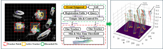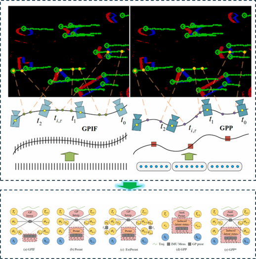 所设计的融合系统集成了一个异步事件驱动前端(Asynchronous Event-Driven Front-End,如图2左),允许从原始异步事件流中追踪高时间分辨率特征轨迹(Feature Trajectory,如图2右)。追踪到的特征轨迹与不同类型的惯性因子一起集成到统一的高斯过程回归框架中实现异步融合状态估计。在后端,利用解析推导的残差雅可比与噪声模型,构建了一个支持迭代优化和动态剪枝的滑动窗口优化器来实现估计问题的最终求解。