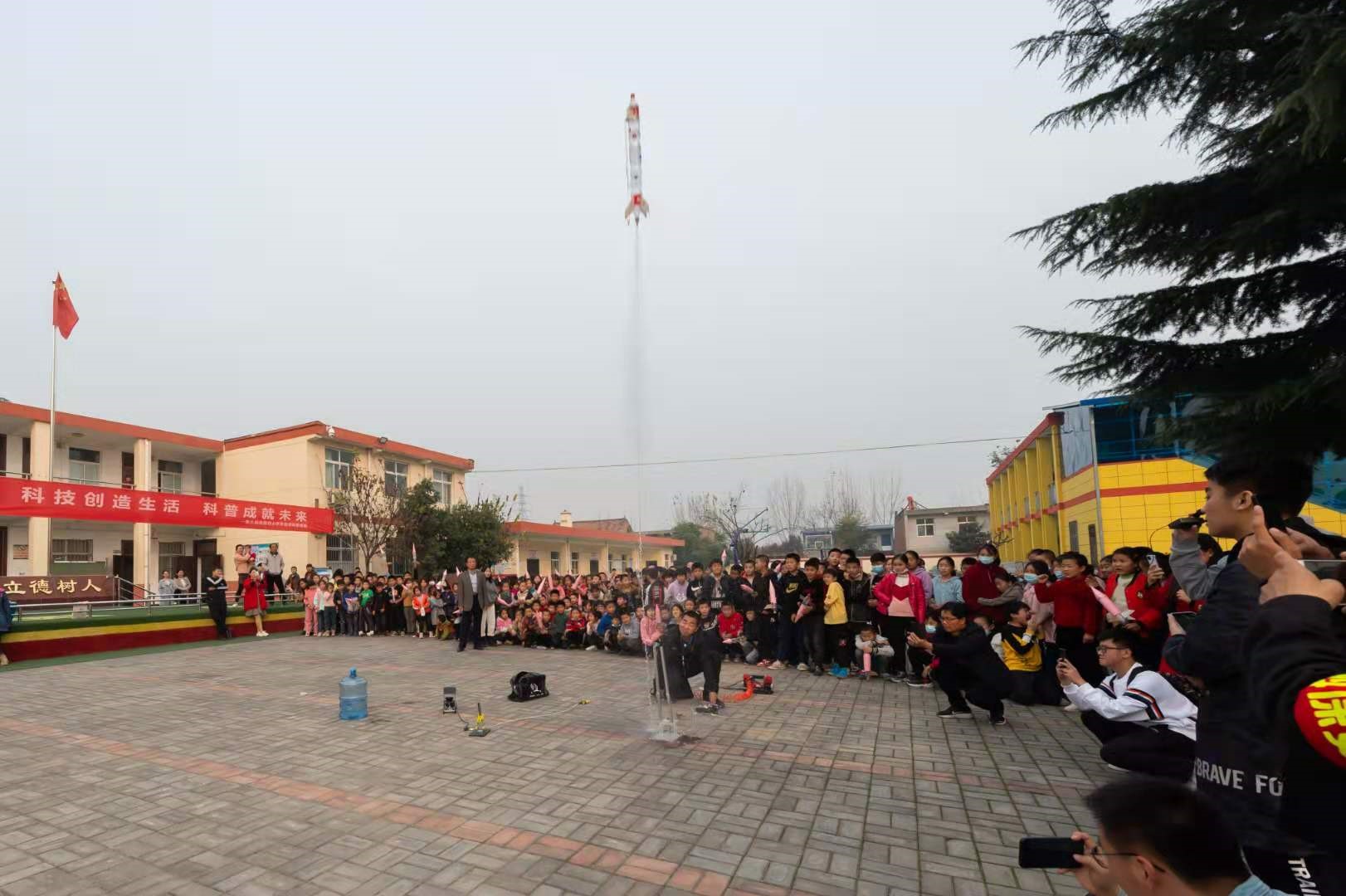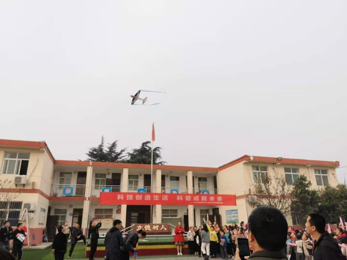 水火箭制作完成后,孩子们被老师带到操场观看航模表演和固体火箭发射。随着一个个航模特技动作的顺利完成,孩子们连连发出一片惊叹声;接着所有人倒数“3,2,1”,火箭发动机被点燃,火箭腾空而起,并在百米高空打开降落伞缓缓降落。孩子们的尖叫声和欢笑声在校园中回荡。