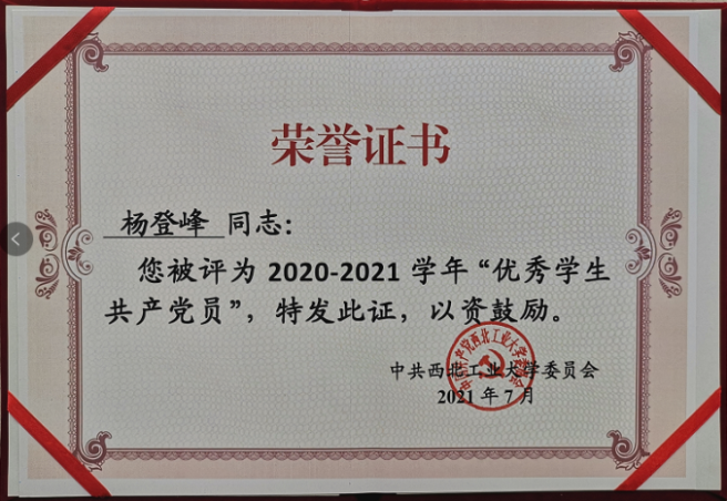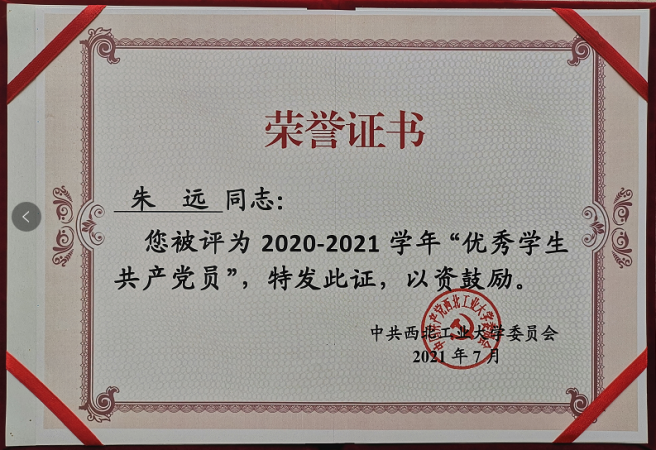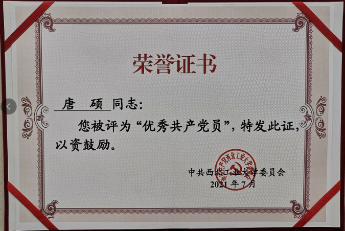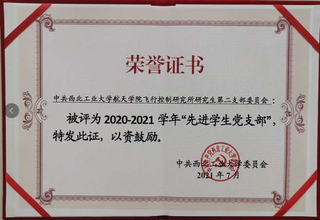在庆祝中国共产党成立100周年之际,航天学院党委获评陕西省先进基层党组织荣誉称号。在学校“两优一先”评选表彰中,学院党委获评先进基层党组织、学院获评学生党建先进学院,唐硕获优秀共产党员、李国骏获优秀党务工作者、飞行控制研究所研究生第二党支部获先进学生党支部、朱远和杨登峰获优秀学生共产党员等荣誉称号。
