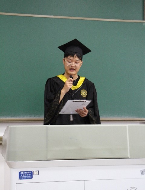 王子腾作为优秀毕业生代表发言,通过回忆宿舍、班级、航天学院的点滴,感谢同学之间的相遇相知、感谢互帮互助,希望全体航天学子秉承“公诚勇毅”校训、“三实一新”校风,在以后的工作学习中,不断创新,奋发图强,勇攀高峰。