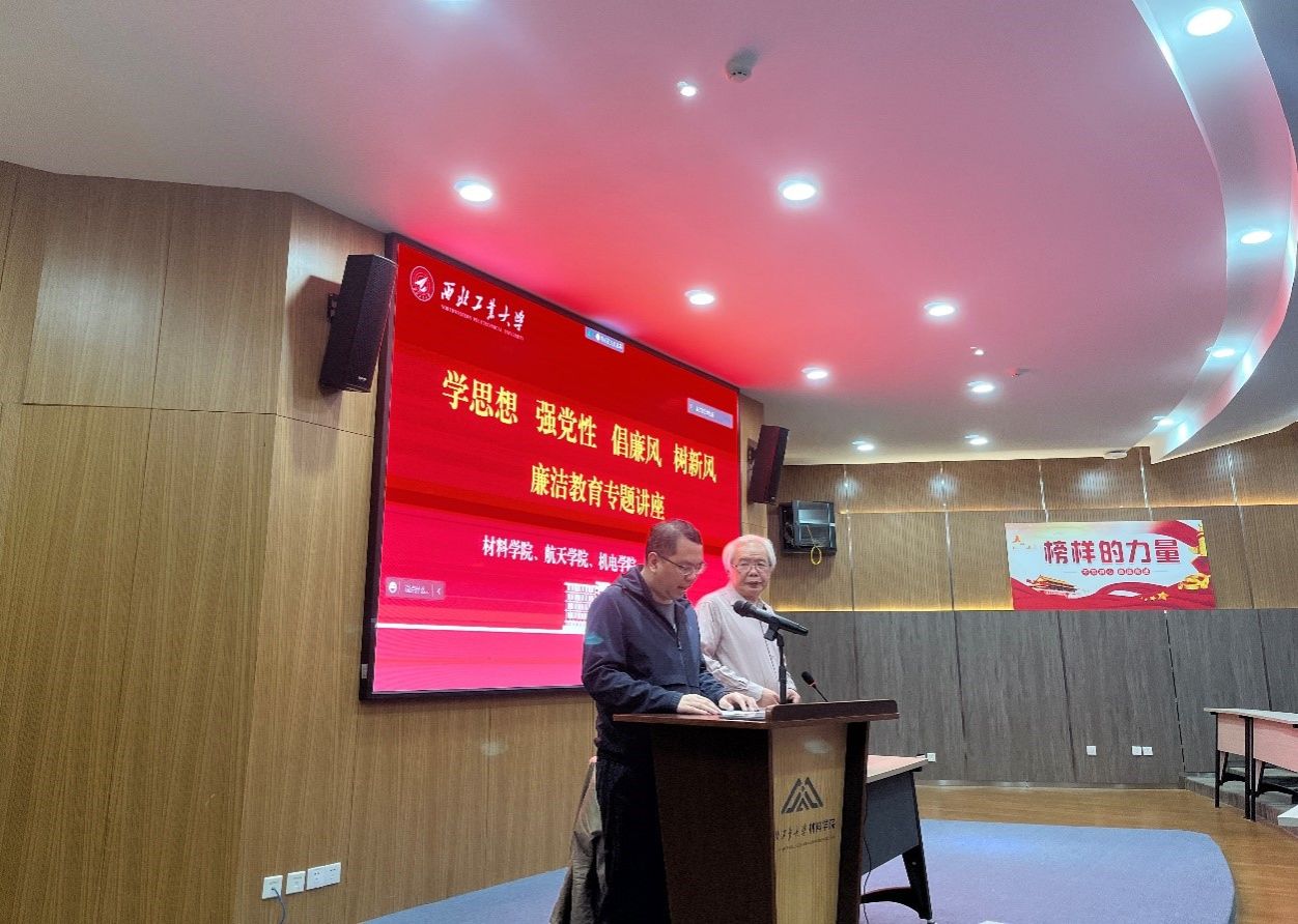 为深入学习贯彻党的二十大精神,进一步推进党风廉政建设,提高大学生廉洁修身意识,6月2日上午,航天学院党委联合材料学院、机电学院及计算机学院党委在研究生东馆开展“学思想 强党性 倡廉风 树新风”廉洁教育专题讲座,邀请到中共陕西省委党校卢飞鹰教授作《中国传统防腐惩贪制度建设与现代启示》主题报告。报告会分线下主会场和线上视频分会场,由材料学院党委副书记蔡利剑主持。