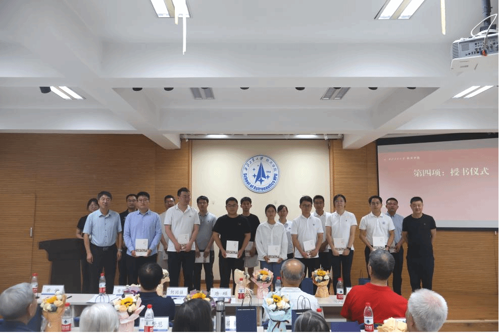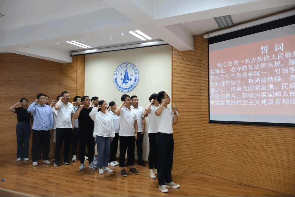 会上,学院为新入职的教师代表们举行了入职宣言仪式,在新入职教师代表张凡领誓下,共同许下对教育事业的忠诚誓言。原航天学院院长唐硕、学院院长黄攀峰共同为新入职教师赠送了我国航天事业和航天教育的开拓者与奠基人之一,著名飞行力学专家、教育家,学校宇航工程系创始人陈士橹院士的传记《剑指苍穹》。希望新入职教师们能学习前辈们爱岗敬业、治学严谨的精神,将那份对教育的热爱转化为对工作的责任、对学生的关怀,为学院的发展注入新活力。