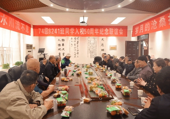10月13日74级8241班16名同学从沈阳、北京、上海、武汉、贵阳、襄阳和河南新县等地集中返校并召开了师生座谈会。会议室正面高挂着横幅: “74级8241班入校50周年纪念联谊会”,两侧一幅是“同学之间的情谊如溪水川流不息”,一幅是“岁月的沧桑抹不去校园的回忆”;表达了同学们的真实感受和热切期盼。会议室后面悬挂“感谢母校,感恩老师,感念同学,感悟人生”的横幅,充分表达了同学积极参加这次联谊会的真正目的。航天学院空天动力技术研究所支部书记吕翔详细介绍了学院和专业的发展历史、目前现状和美好前景,听的得大家心潮激荡,为“天下工大,世界三航”的美好未来深感自豪和光荣。校友们结合自身实际,逐一发表了感言,表达了自己对母校,对老师和对同窗好友的深情厚谊和对美好未来的热切期盼。师生多年不见,相聚格外激动。紧握双手,紧紧拥抱,热泪盈眶,互致问候,场面感人。