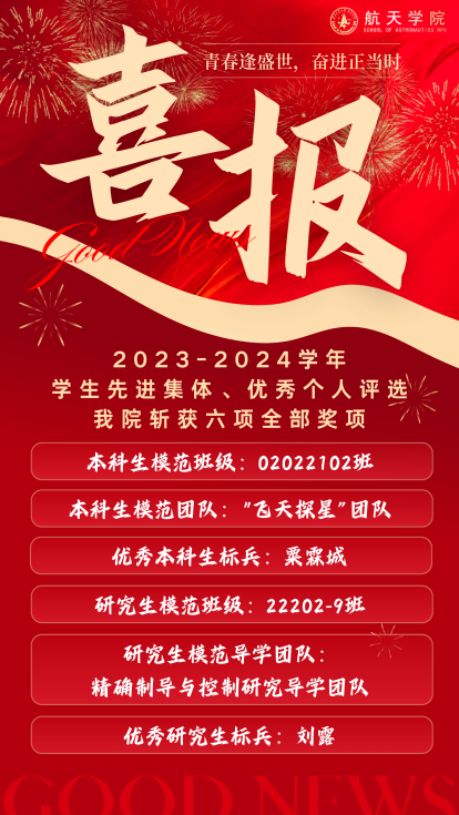 2024年10月22日—10月31日,西北工业大学举行2023-2024学年模范班级、模范团队、优秀学生标兵评选展示活动。这六项称号是西北工业大学授予学生先进集体和优秀个人的最高荣誉。一年来,航天学院各班级、团队和学生个人砥砺奋进,追求卓越,以努力成为专业精、系统强、重实践、能担当的“总师型”人才为目标。经过6场激烈角逐,实现了本科生模范班级、本科生模范团队、优秀本科生标兵、研究生模范班级、研究生模范导学团队、优秀研究生标兵这6项重量级荣誉的全满贯,这也是学院首次在该项评比中取得大满贯。他们用青春奔赴星辰大海,用行动践行初心如磐,下面让我们一起见证他们的青春风采吧!