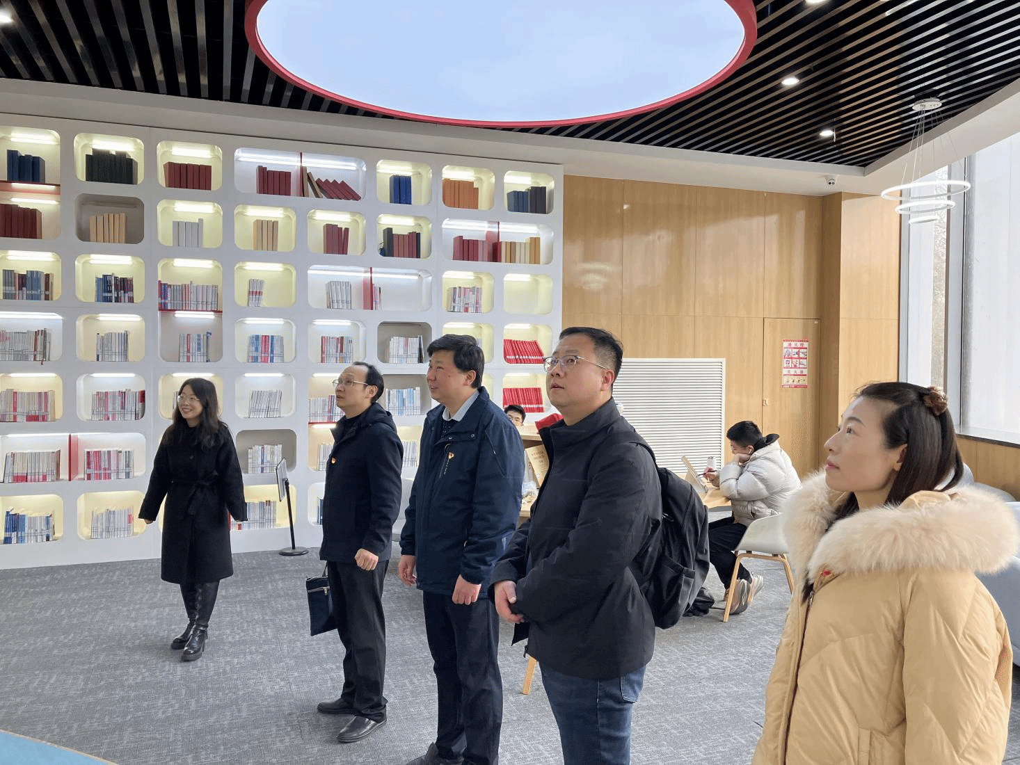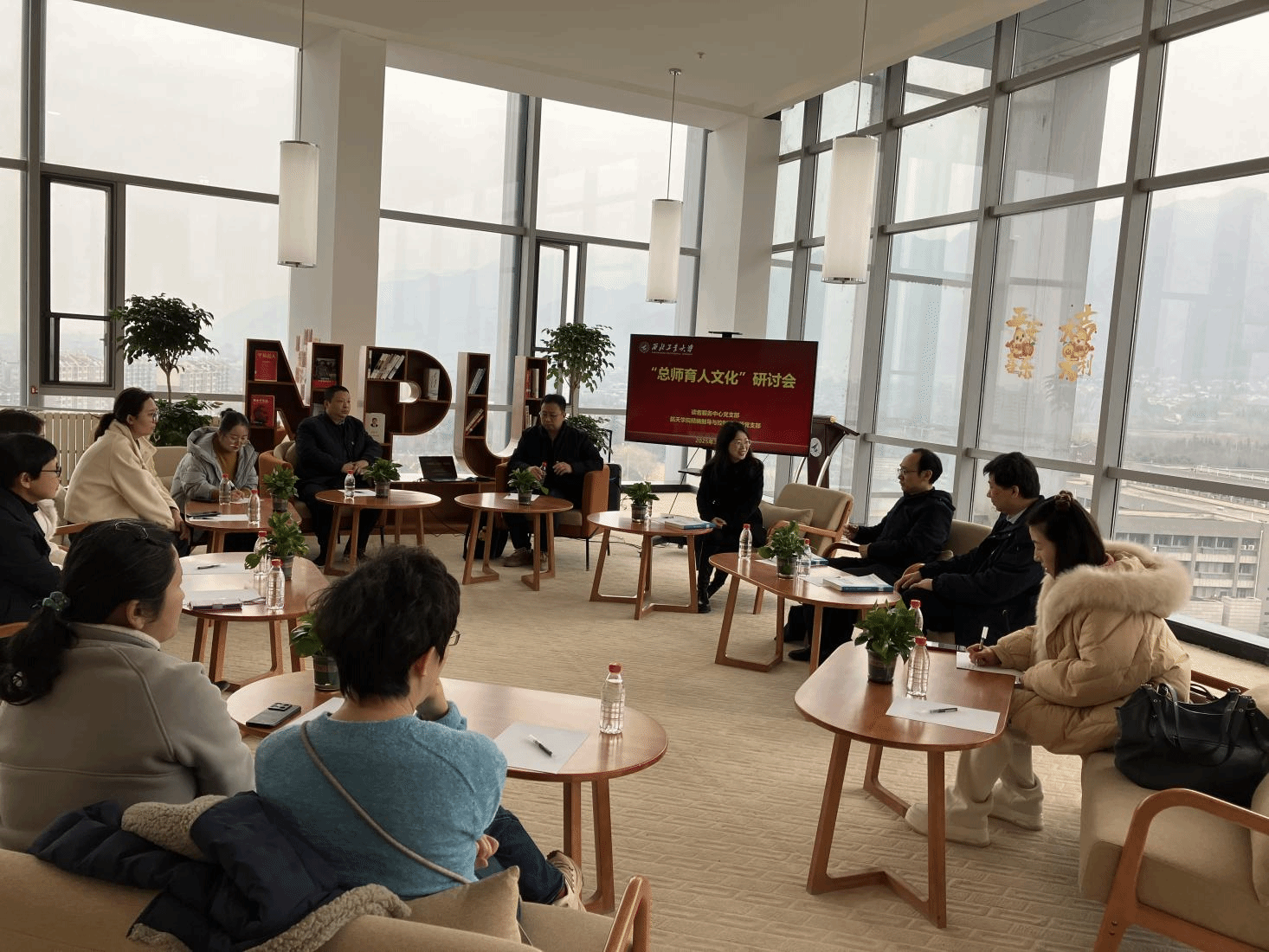随后,大家来到了九楼“云上书阁”,其作为综合研讨、休闲探讨的多功能活动区域,是长安校区图书馆的又一特色区域。在这里,双方支部党员们围绕“总师育人文化”展开研讨。精导所所长郭建国教授介绍了学院和研究所在“总师育人文化”的贯彻过程中,从“多学科、多元化”的教育方法,“工科、理科、文科”互相结合的教育模式等方面开展的工作。支部书记卢晓东对学校图书馆日新月异的发展和进步表达了赞叹,同时通过整理书架的学雷锋义务活动体会到了图书馆全体教师们工作的辛苦和重要性,希望双方支部通过党建与业务交流活动为师生办实事,推动“总师育人文化”的走深走实。
