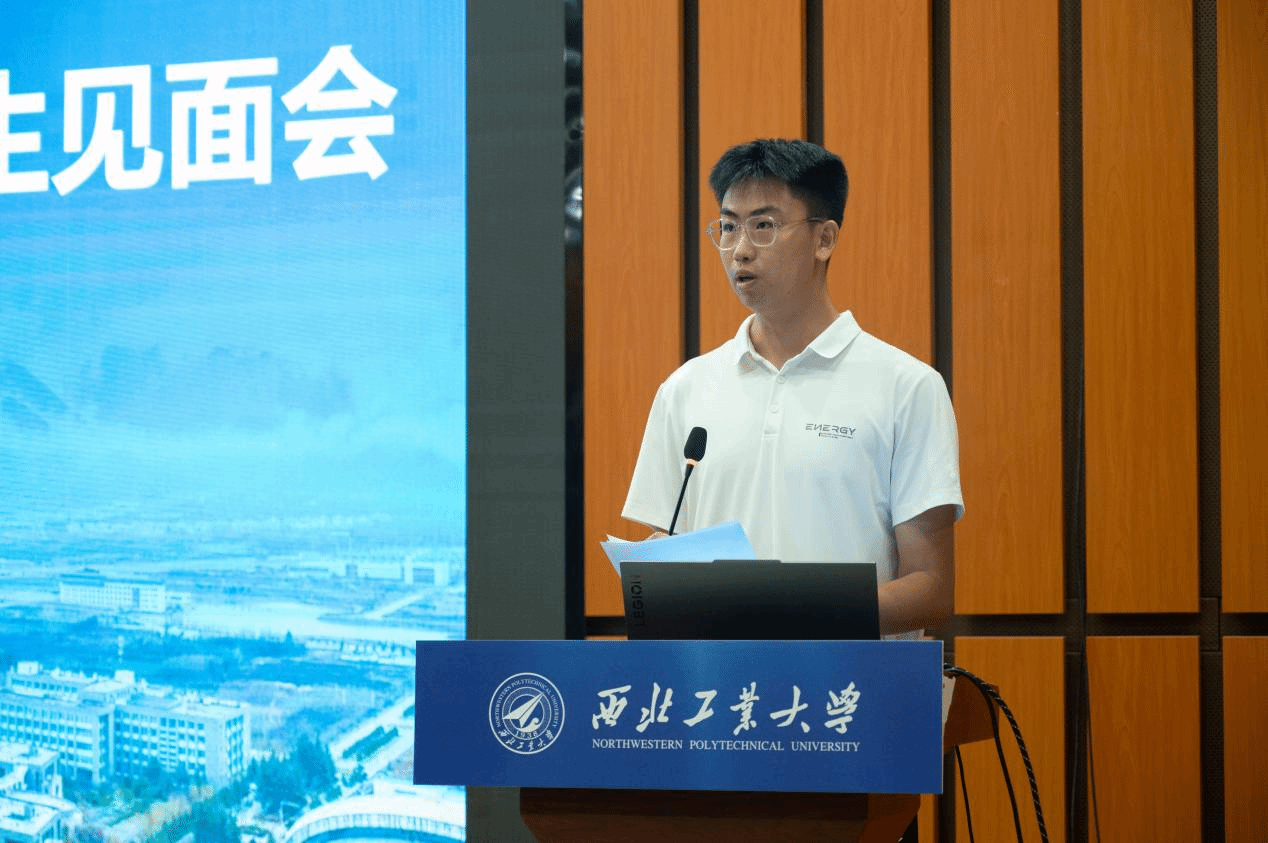 接着,新生代表、航天学院陈士橹飞天班吕恩豪同学发言。他分享了自己因“长征火箭”“神舟飞船”“飞天二号”等国之重器萌发航天梦想,最终选择西工大的初心,并代表全体新生表态:将以“公诚勇毅”校训为指引,以“三实一新”校风为准则,把个人理想融入国家航天事业发展,努力成为 “勇攀高峰的追梦人、国家战略科技力量的未来担当”。