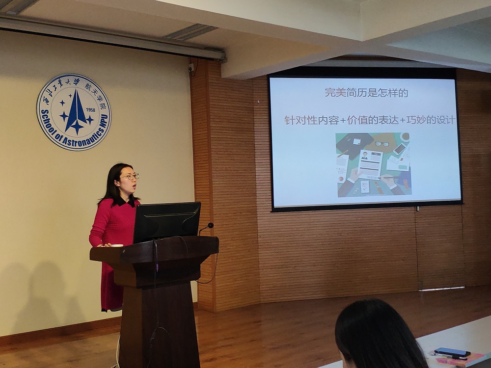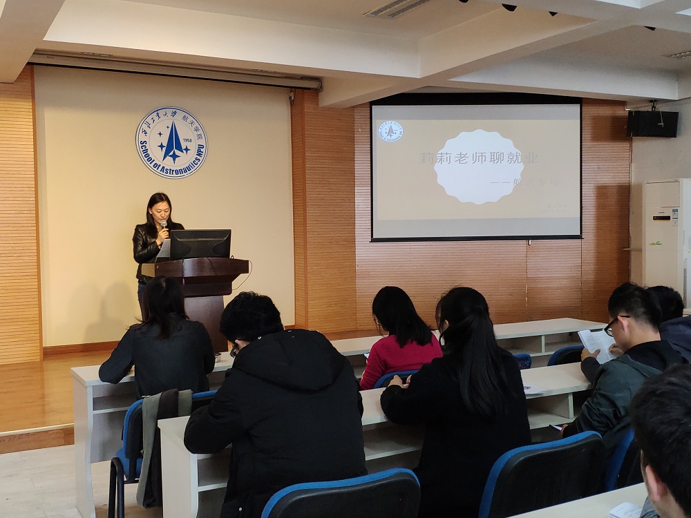 为进一步加强学院就业工作,增强学生的职业规划能力,使学生提前了解就业形势,做好就业准备,2019年3月21日下午,航天学院在四号楼六楼多功能厅举办了“莉莉老师聊就业之航天专场”分享会,邀请学校党委学生工作部副部长、学生处副处长王莉和就业创业指导服务中心朱莉老师主讲。航天学院研究生辅导员罗淑娟、本科生辅导员杜飞、苟建军,全体2020届研究生,部分本科生参加。分享会由航天学院党委副书记常威威主持。