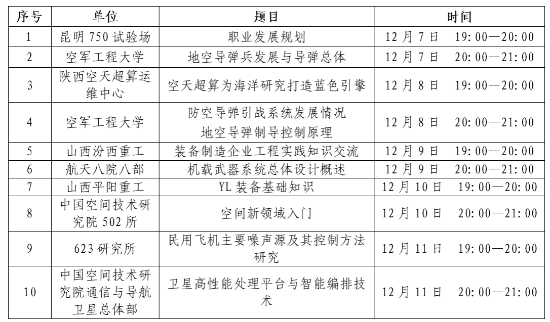 知识讲座共计10场,12月7日至12月11日每天19:00—21:00时段各安排两场,具体时间安排如下表。讲座采用腾讯会议形式进行,会议号670-4706-3278,请各位同学提前10分钟进入会议室,入会后关闭摄像头及手机麦克风,更改个人用户名(学院-学号-姓名,如“航天/航海-XXXX-张三”)便于各班点名签到。