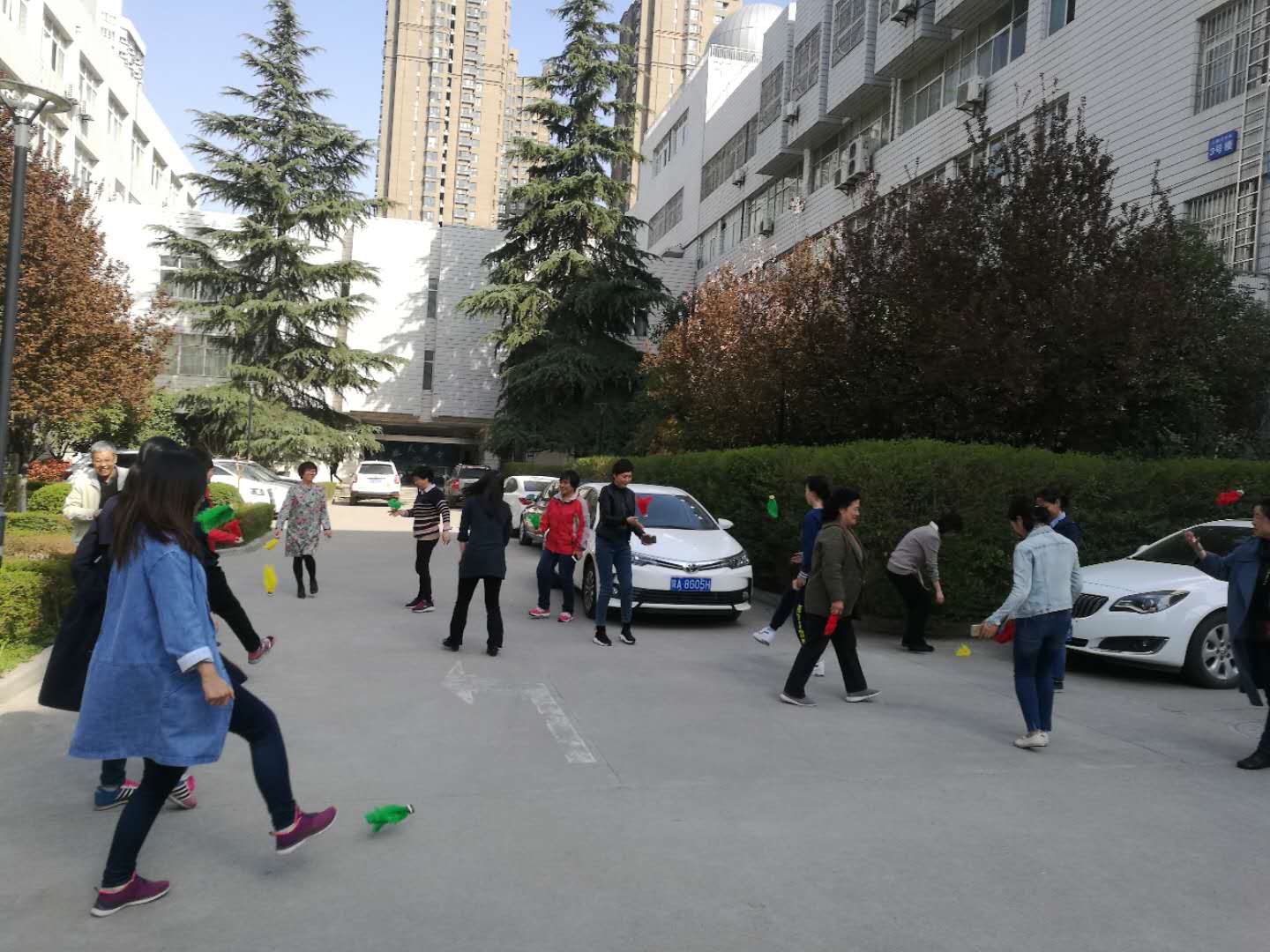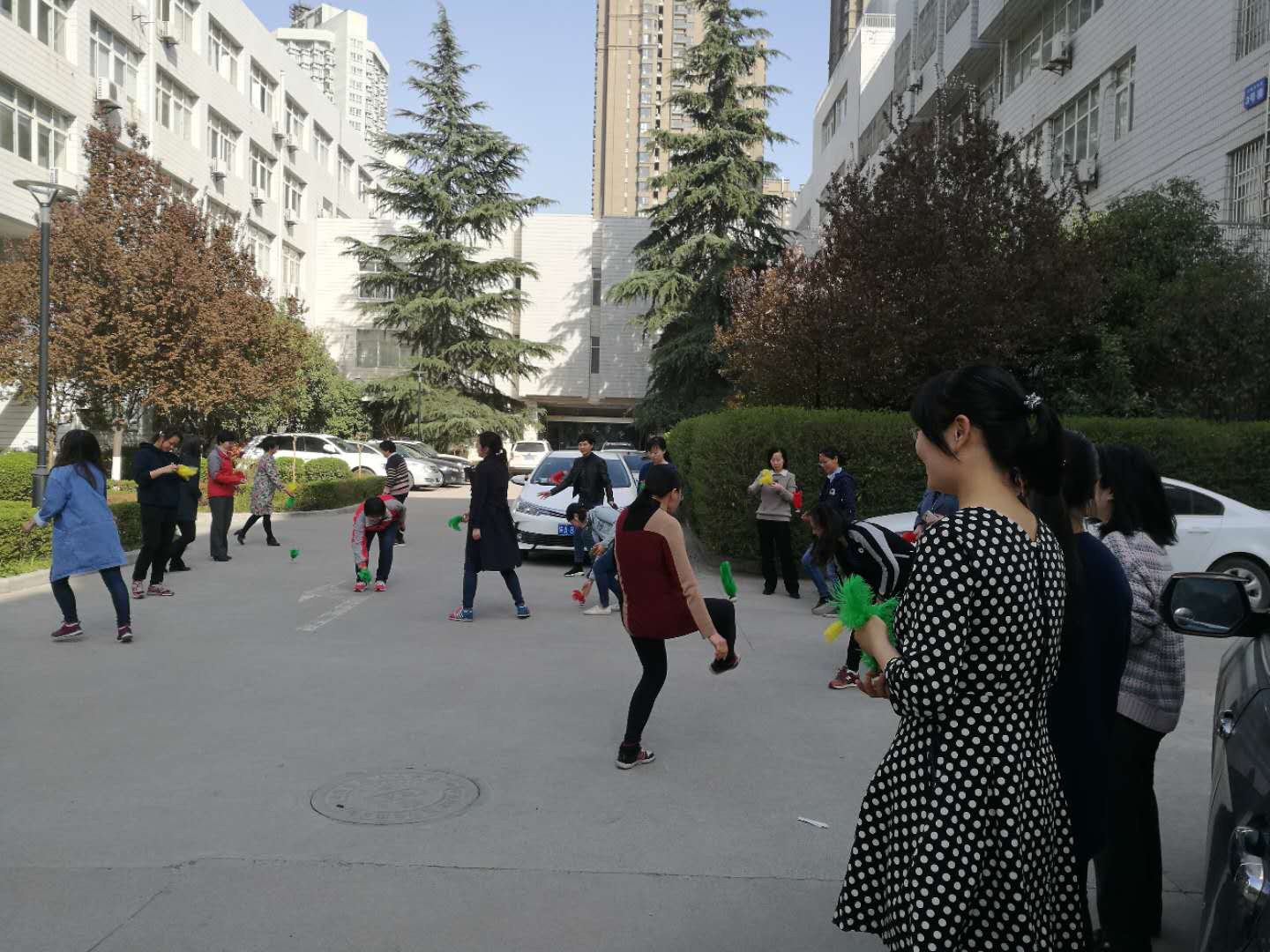 比赛还未开始,已有不少老师提前拿起毽子进行赛前热身。比赛前,队员们围着学院办公楼集体健步走一圈,大家放下手头工作,友好交流,其乐融融。热身健步走结束后,队员们投入了紧张的毽子单踢两分钟计时比赛。老师们一个个精神抖擞,做出了各种各样的动作,有的一直用一只脚踢,有的双脚交换着踢,抛毽、甩手、踢毽,眼睛追着毽子的起落,五彩的毽子被踢得上下翻飞迟迟不愿落地,整个比赛充满了奋力拼搏、激情欢乐的气氛。