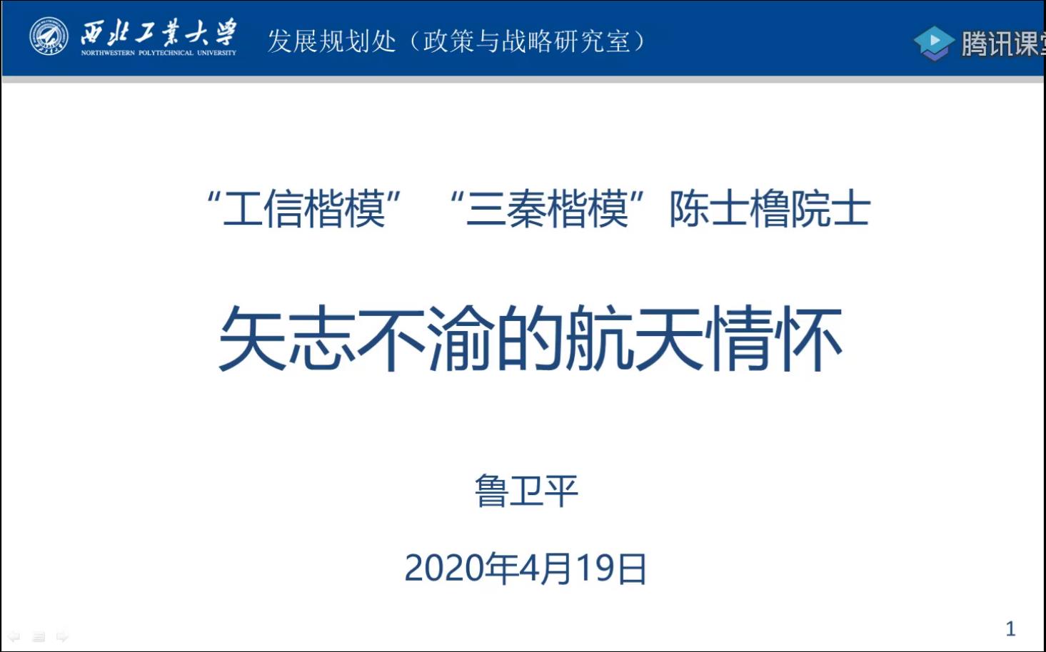 4月19日上午,航天学院发展对象、入党积极分子迎来新学期第一节党课。本次专题党课通过“翱翔青年云讲堂”开展,本场云讲堂由校团委、航天学院主办,西工大青年宣讲团、西北工业大学研究生会承办,特别邀请了西北工业大学政策与战略研究室主任兼发展规划处副处长、《剑指苍穹—陈士橹传》主要作者鲁卫平担任主讲人,讲述陈士橹院士“一个甲子的坚守”。