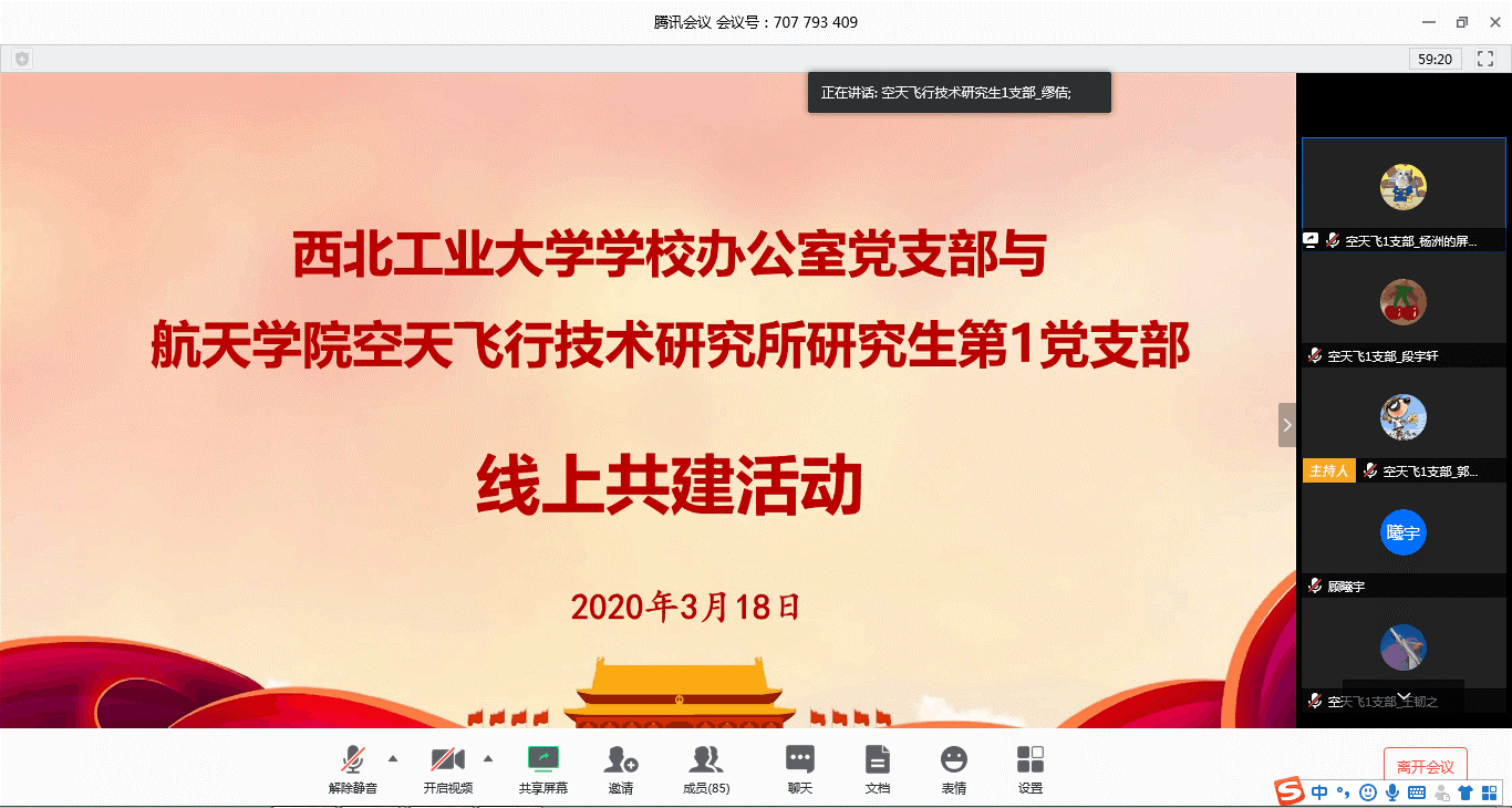 3月18日下午,学校办公室党支部与航天学院空天飞行技术研究所研究生第1党支部全体党员齐聚云端,以“我身边的抗疫故事”为主题,开展了一次别开生面的线上支部共建活动。航天学院党委副书记王强、学生辅导员、学院全体学生党支部书记及24位班级小导师也参加了本次共建活动。