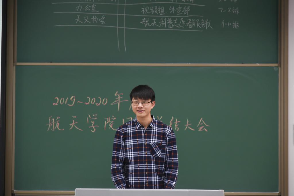 最后,团委书记吴蔚楠做总结发言,对本学期学生会及各社团的工作成果给予了肯定,并从“规范”、“时效”、“活力”、“特色”四个方面对新一年的工作提出了要求。他指出:一.举办活动应规范,策划和组织都应形成规范过程与完整体系;二.前期宣传工作与后续总结完善工作要及时,拒绝一切拖延的行为;三.做学生工作要永怀热忱,不忘为同学们服务的初心,努力工作,踏实奋进;四.举办活动要有精品意识,突出航天学院的特色,打造航天学院精品品牌活动。他强调,活动策划、组织应仔细考量,摒弃为活动而组织活动的做法,更多地思考活动对同学们的意义,同时发挥宣传效力,扩大自身影响力,让更多人感受到航天学院的风范。最后,吴蔚楠用奋战一线的航天人在长征五号发射成功后的一句话,与大家共勉:“不惧怕走出自己的圈子,不懈怠更新自己身体里的知识,一点一点突破边界,相信一切皆有可能,胖五就是我们每个航天人最好的榜样。”