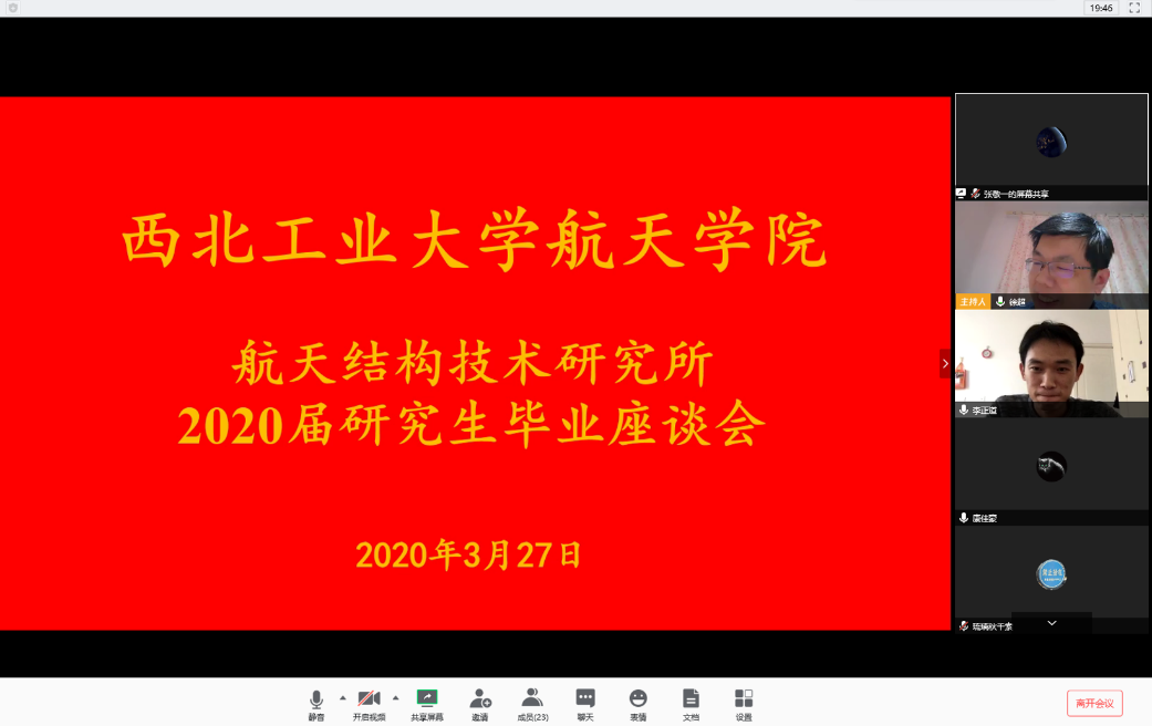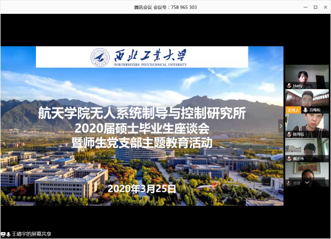2020年3月25日至4月2日,航天学院按照学校要求,以研究所为单位组织召开了“感恩工大情 激扬爱国志”2020届研究生毕业座谈会,学院领导、研究生导师和2020届毕业研究生共同参加。