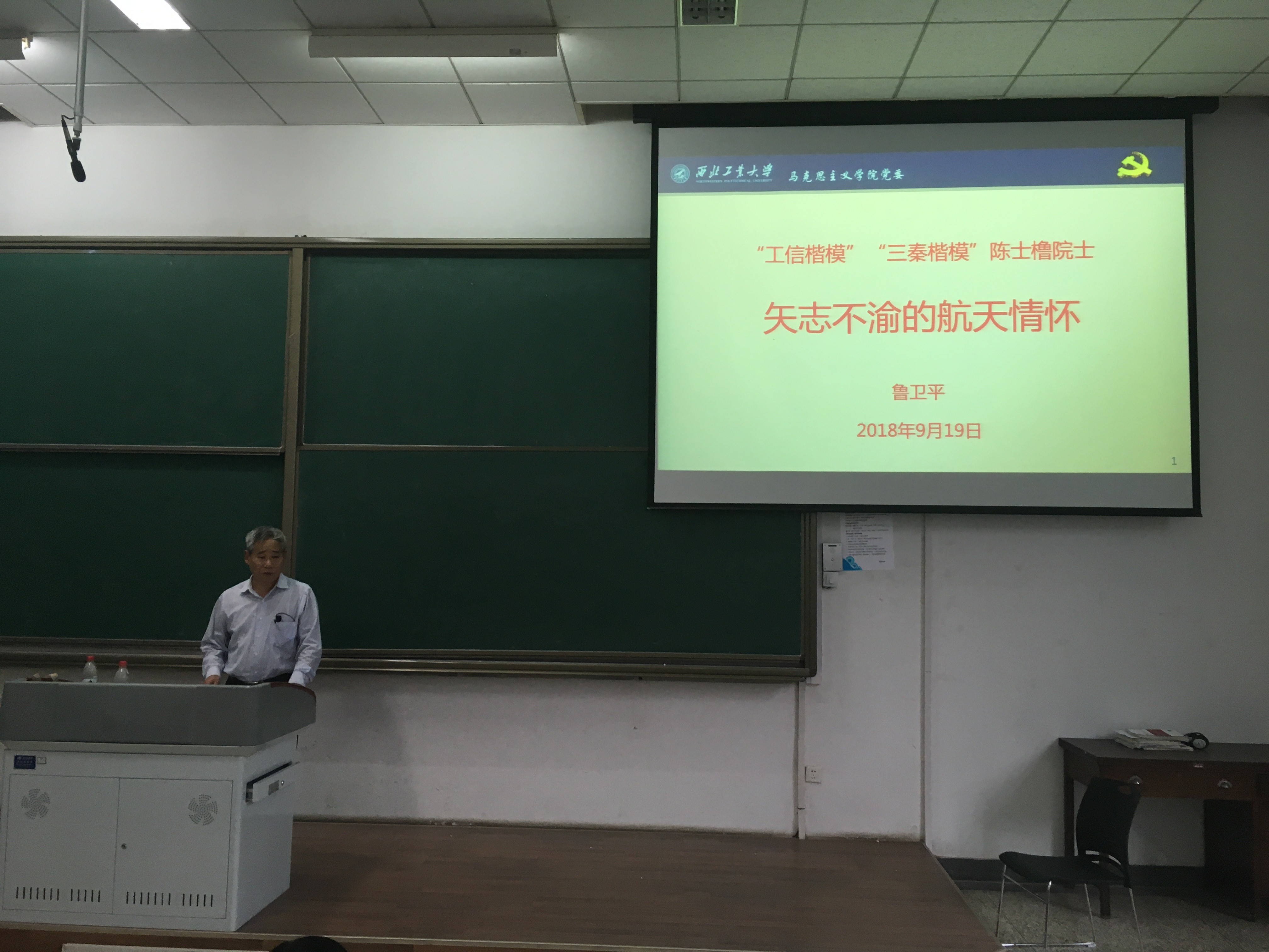 9月19号下午3点30分,航天学院在长安校区教学西楼D-101举行2018级本科生新生缅怀陈士橹院士报告会,邀请马克思主义学院鲁卫平老师做“矢志不渝的航天情怀”为主题的报告。181名新生参加本次活动。报告会由2018级本科生辅导员程昊宇老师主持。