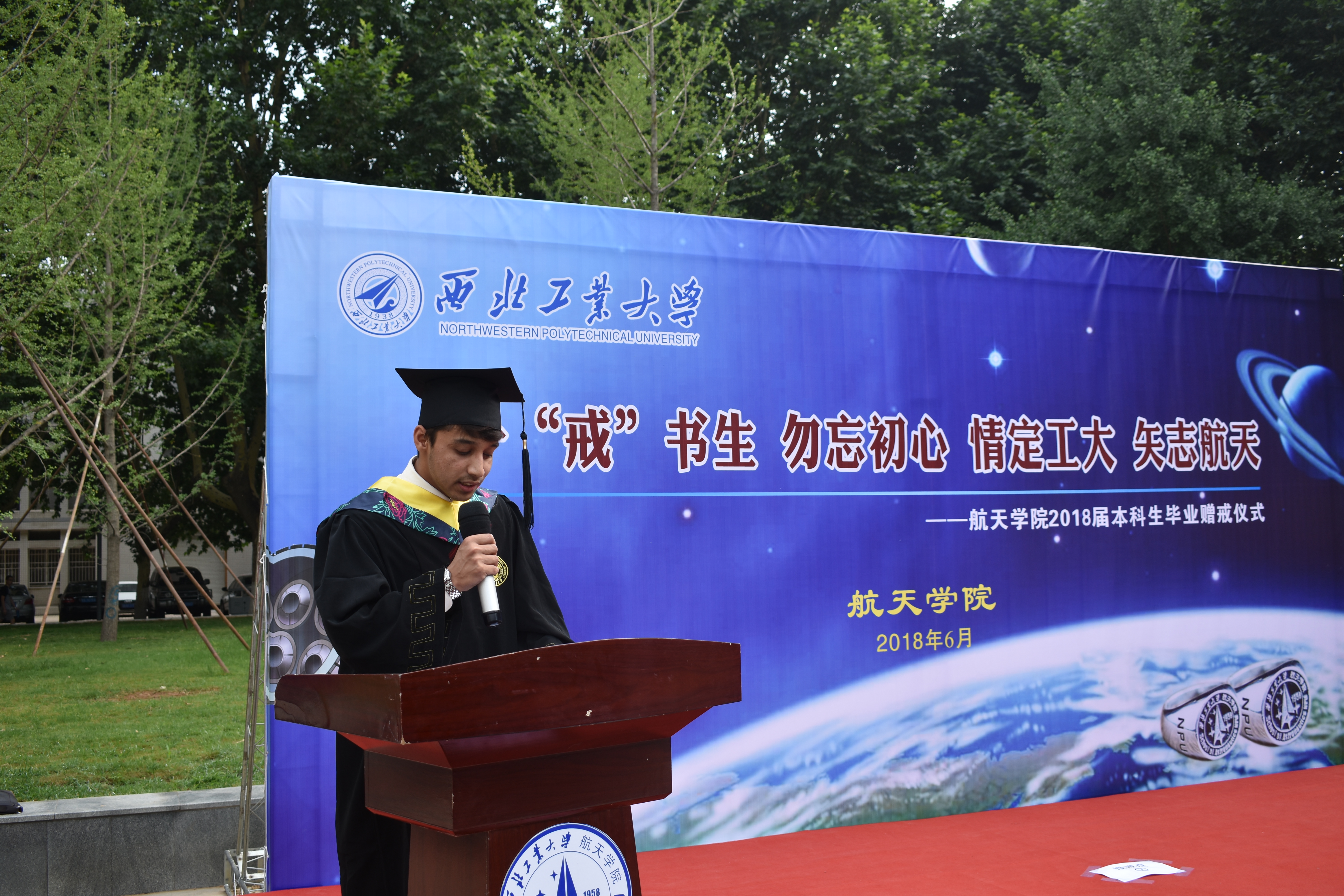 2018年6月15日上午,航天学院在友谊校区图书馆广场隆重举行2018届硕士毕业生航天戒授戒仪式。航天学院院长唐硕、副院长刘佩进、张科、龚春林、党委副书记岳晓奎、张永福、教学办公室主任张研、学院国际化秘书翟雯,及各小班班主任出席本次授戒仪式。仪式由航天学院党委副书记张永福主持。